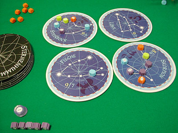 はったりの要素の強いゲームです。裏にしておいたコマで相手を撹乱するわけです。こういうと比較的よくあるタイプのゲームのようですが、どの星座で得点計算を先に行うかという点でも考えさせますし、3位以下でも分け前にあずかれるスコアリング・システムもじわじわ効いてきます。何といっても星座をテーマにしたのが面白いところです。