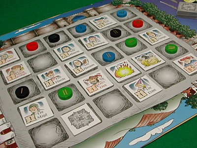 市場は30マスから構成されています。プレーヤーはそれぞれ円形の木でできている自分の色のお店コマをもちます。ボードのマスにお店を配置して儲けるわけですが、お客がいなければ収入はありません。縦でも横でも、自分の店があるのと同じ列にお客タイルが配置されれば収入になります。
