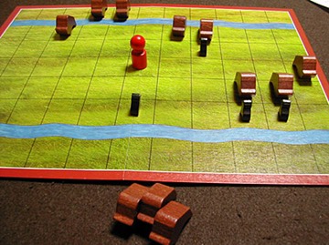 2人のプレーヤーはバッファロー側とネイティブ・アメリカン側をそれぞれ担当します。バッファロー側のプレーヤーは、川の手前にバッファローをずらりと並べます。目標は、ボードの向こう側に一頭を到達させることです。手番でできるのは、バッファローを一つ選んで一マス前進させることだけです。(将棋の歩と同じです。)