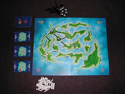 例えば、ある島の支配権を黒が確立するとその島にかかる白の「杖」はすべて取り除かれますが、その「杖」で結ばれているもう一方の島の白の「杖」が1つ減ることにもなりますので、それによって支配している島の過半数が維持できなくなったら白は「カフナ」コマを手元に戻さねばなりません。さらに黒がカードをプレイして、そちらの島でも支配権を確立できれば、そこの敵の「杖」も一掃できる、というように連鎖的に支配権を獲得できます。ただし、カードは1枚だけの補充ですから、その後手札が弱くなり相手に逆襲されることも考えねばなりません。手札にやや運もありますが、先読みと決断を要求される戦略的なゲームです。