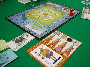 さて、以上はこのゲームの表の顔で、本当に面白いのは、これらのボクシングの試合に全プレーヤーが賭けるところにあるのです。ゴングが鳴る直前に、試合をする当のプレーヤー達自身から賭けます。この賭けの様子や、ファイトカードの残り具合などからあれこれ推理して、他のプレーヤーも賭けます。賭けに他のプレーヤーが応じた場合は、プレーヤー間のお金のやり取りになります。応じなかったら銀行とのやり取りです。銀行とのやり取りで負けたら、賭け金はボーナスとしてリングの横に積まれ、終了時にもっともファイトマネーの高いボクサーをもっているプレーヤーのものになります。