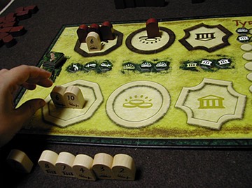 直接、選挙に影響を与えるのは、もちろん、選挙が行われている分野の自分の建物に、そのシンボルが描かれた木製タイルを配置することです。例えば、軍事指導者(将軍)の選挙が行われているなら、自分の側のその建物(城塞)に軍事シンボルの描かれた「5」の木製タイルを置けば、その数字の分だけ投票したことになります。置くときには何を置いたか相手に見えないように置き、互いに3個配置したら公開します。投票した数字の合計が多い方が選挙に勝ったことになります。
