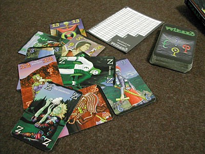 と、ここまでは全く「オー・ヘル」の説明です。この「ウィザード」は、通常のトランプのカードに加えて、ウィザード・カードとジェスター・カードという特殊なカードがそれぞれ4枚ずつ、計8枚入っています。ただそれだけです。しかし、これらのカードはいつでも場に出せるので、ビッドがなかなか計算通りいきません。そこが好ききらいの分かれるところです。