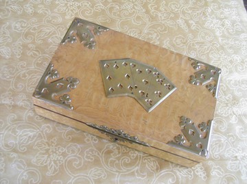 バーズアイメイプルの頑丈なケース、金属製の飾り、中には古いトランプのデックが2組と、ホイストマーカー、無数の真珠母ゲーミングカウンター。インターネットオークションの黎明期、2004年、アメリカはオレゴン州のディーラーより買いました。かなり思い切った買い物でした。若かった。