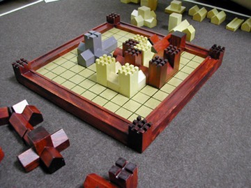 建物の用具が美しいアブストラクト・ゲームだ。囲碁タイプの囲い込みゲームで、多く駒をおいた方が勝ちになる。二戦目はうっかりしてしまって回復できなかった。終わりは建物がギュウギュウしますな。面白かった。