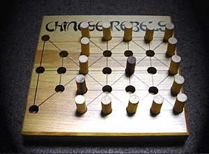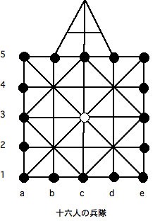 中国から来たというのは似たようなゲームが中国にもあるからで、「十六人の兵士」とか「皇帝と反逆者」とか呼ばれているらしい。参考のために、ボードを挙げておく。ちょっと三角の部分の形が日本と違う。マレーの本によると、このゲームでは、兵士も捕獲ができる。その捕獲ははさみ将棋と同じである。皇帝を二つの兵士コマではさめばよい。皇帝はさっき説明したように割込み捕獲である。実はマレーの本には皇帝側の勝利条件が書いてないのだが、たぶん、はさむのに不十分な数まで減ったら皇帝の勝ちだろう。兵士の勝利は、動けなくする、閉じこめる、捕獲するのいずれかということになる。