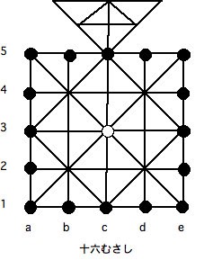 「十六むさし」は「八道行成(やさすかり)」ともいわれて、おそらく中国から伝わったゲームである、ということは少し調べればわかる。似たようなゲームはあちこちにあるらしく比べると楽しい。「十六むさし」のボードは下図である。真ん中の白いコマが大将、取り囲んでいる黒いコマが「むさし」、つまり武士である。例によって適当に描いたので、自作するときはもっと綺麗にしてみてください。ときどき骨董市や古本屋で、メンコみたいなコマに武者絵を描いた「十六むさし」を見かけることがある。